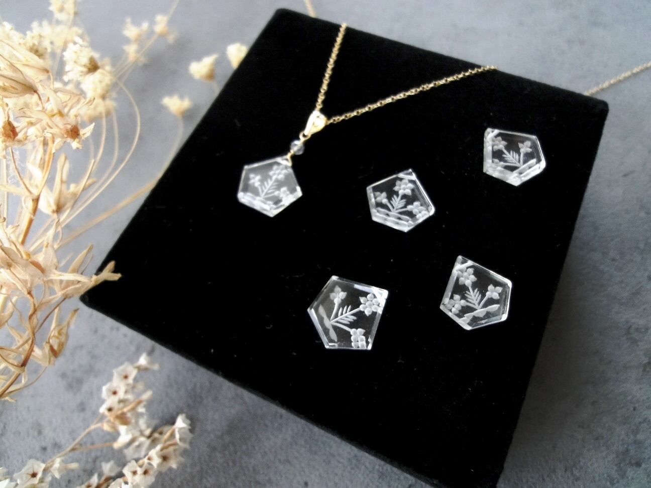 フラットに研磨した水晶の裏側に、愛らしい花々の彫刻を施した、