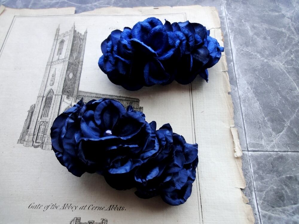 ロイヤルブルー色の滑らかなベルベット生地の花びらをたっぷりと使い、