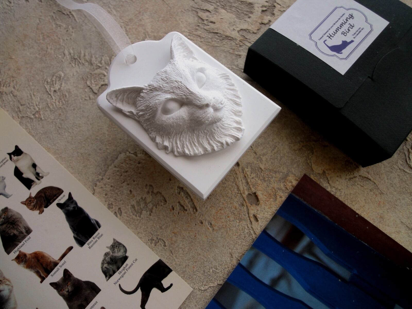猫の顔をモチーフにしたアロマストーン製のオーナメント。