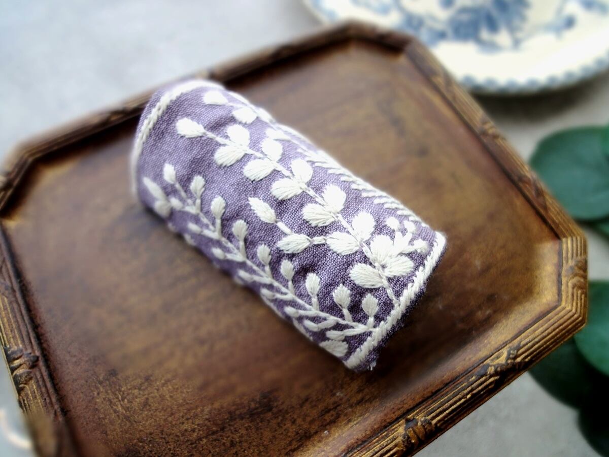 くすみ色の生地の上に白い糸でハーブの絵柄が刺繍されており、