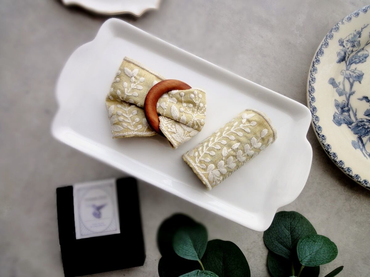 くすみ色の生地の上に白い糸でハーブの絵柄が刺繍されており、