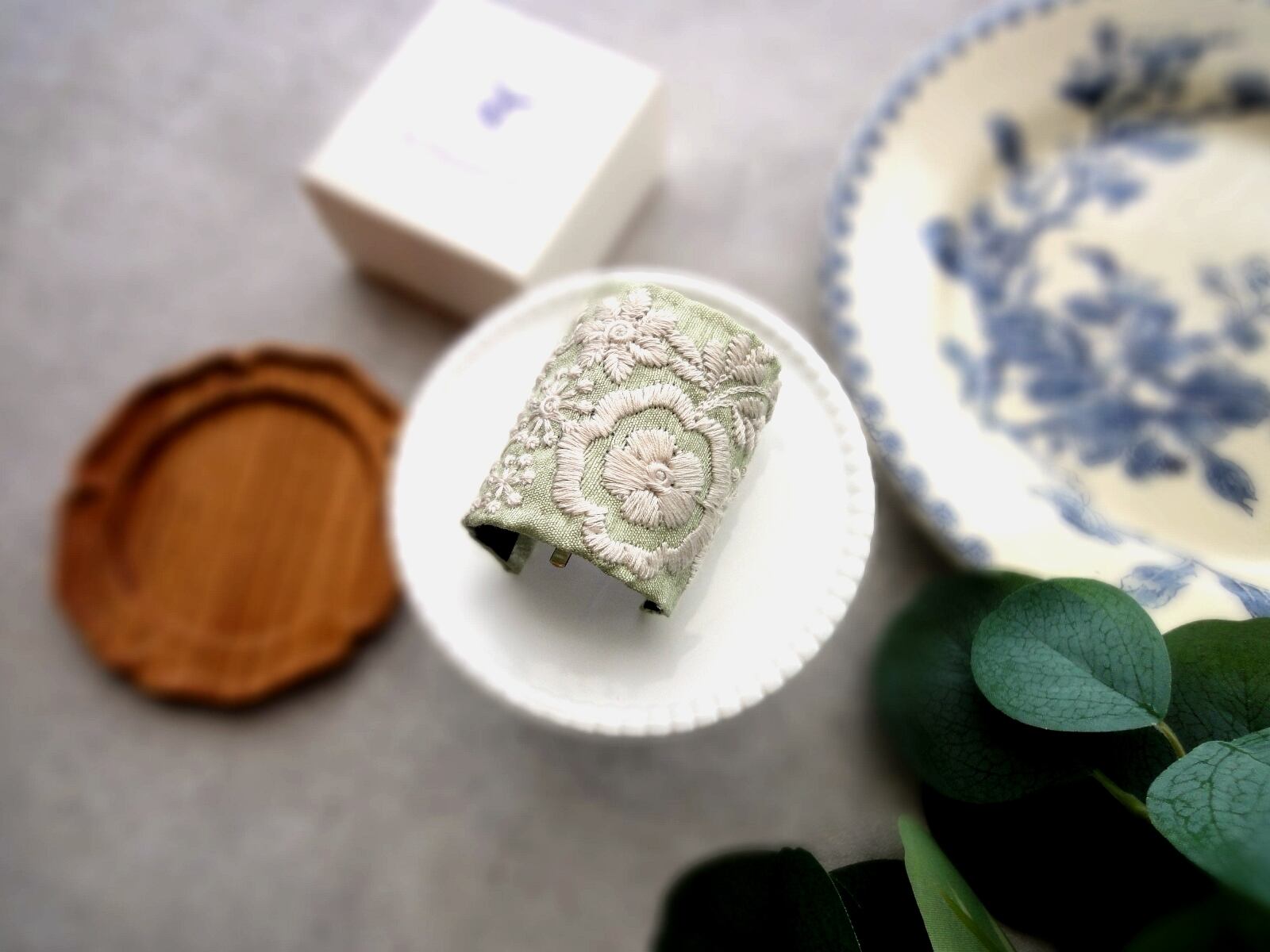 クリーム色の糸で植物の絵柄が刺繍された、