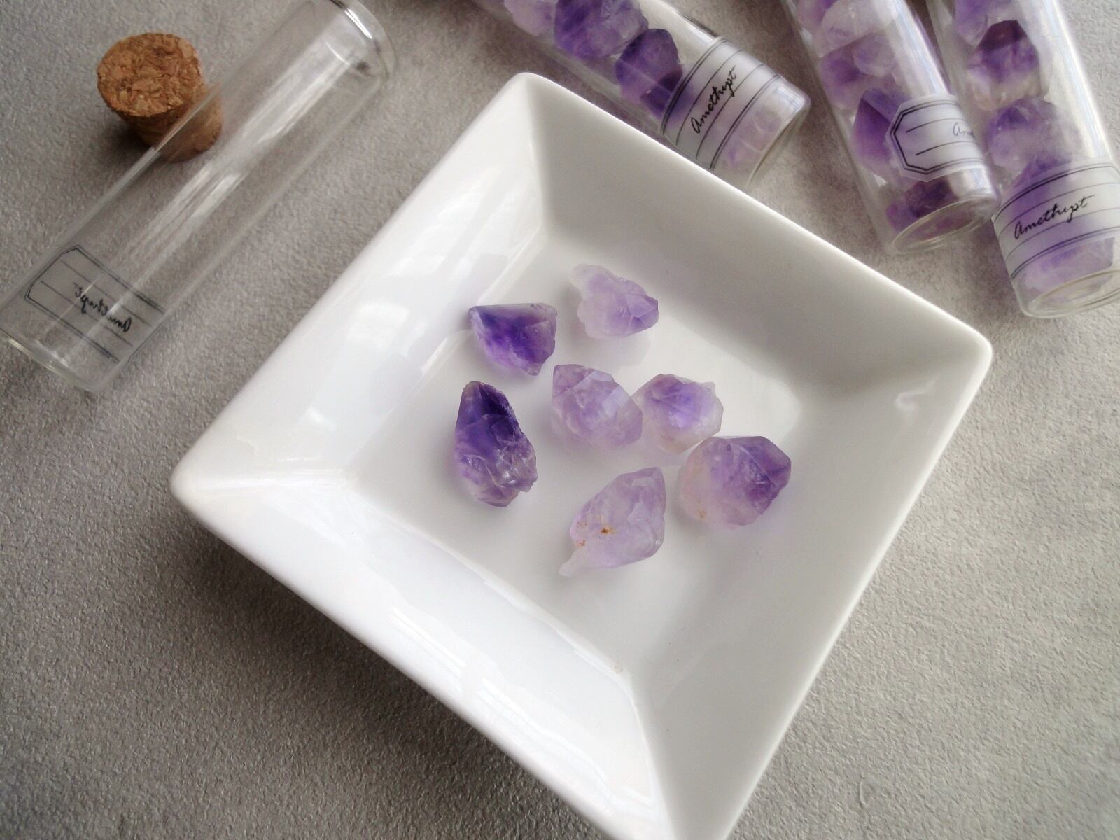 小さなガラスの小瓶に、アメジストの小さな原石2粒を入れてお届けします。
