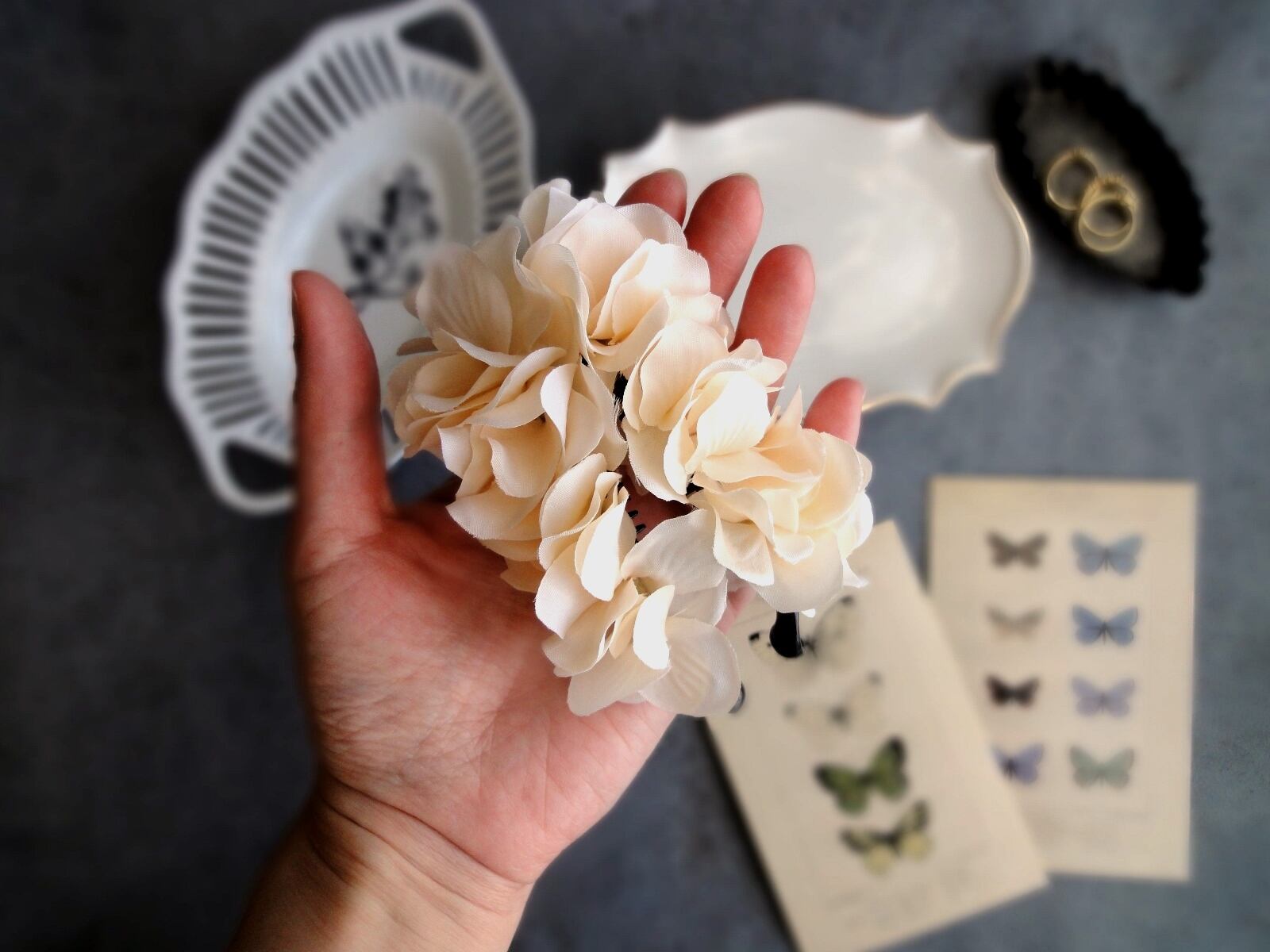 愛らしい雰囲気のあふれる、紫陽花でバナナクリップをご用意しました。