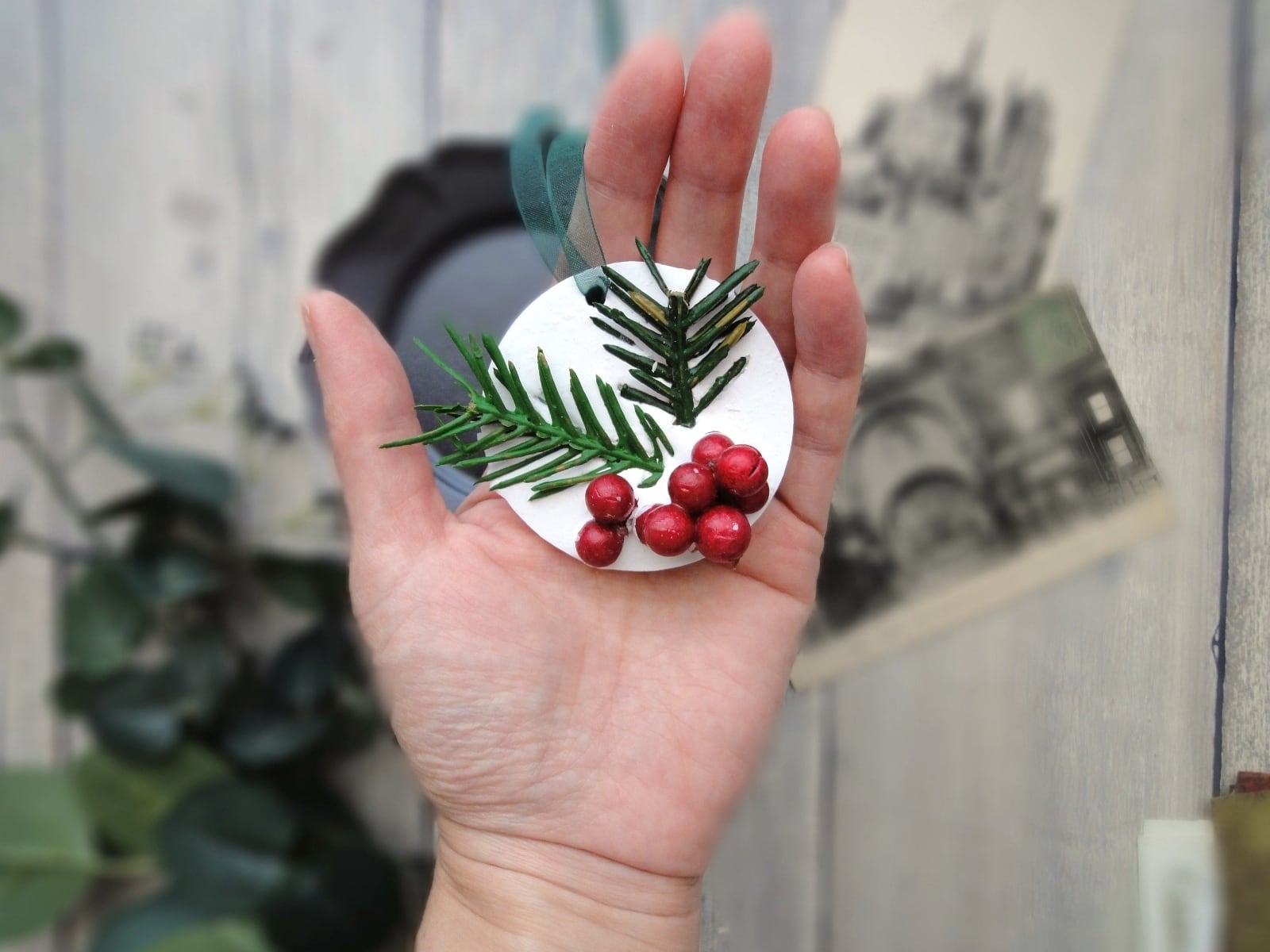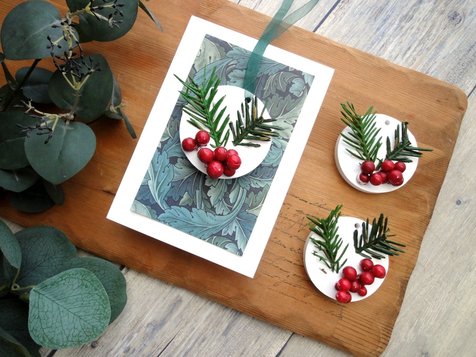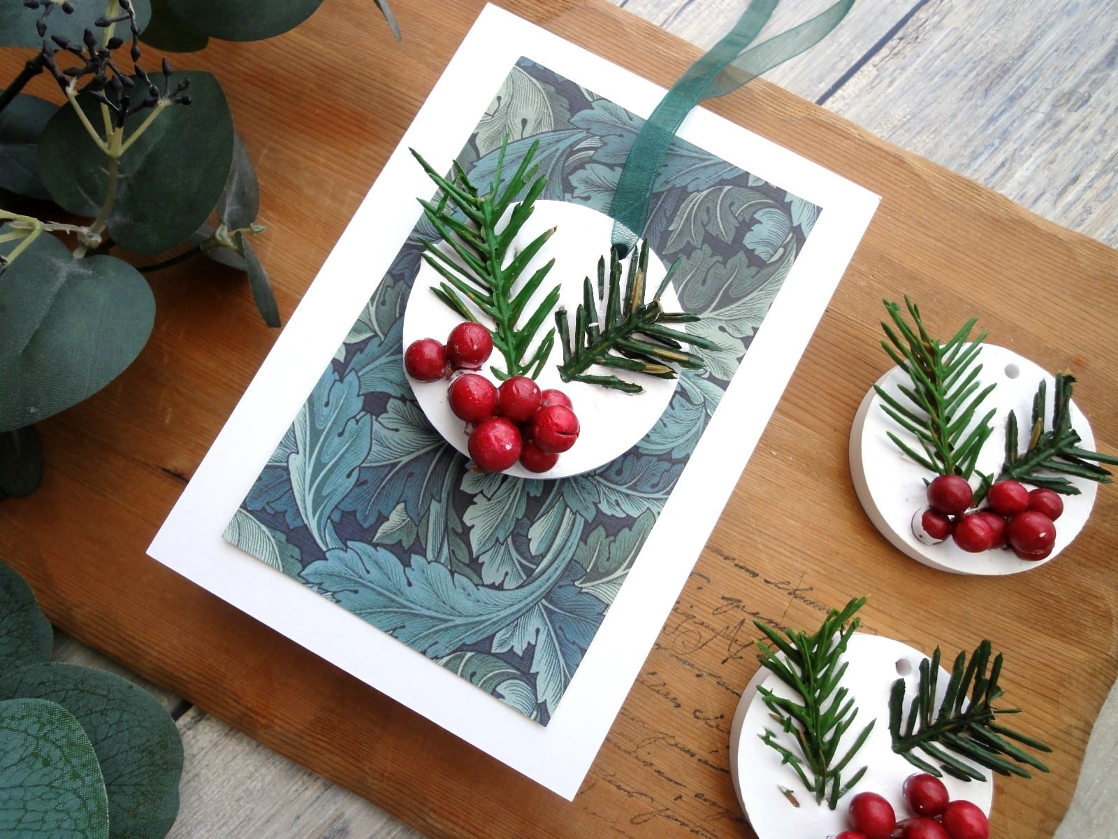 Xmasらしい、赤い木の実ともみの木の枝の組合せ。