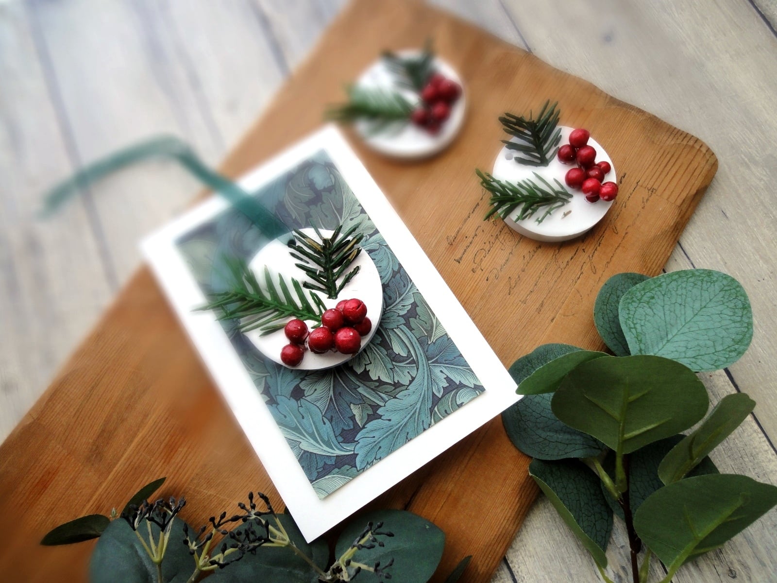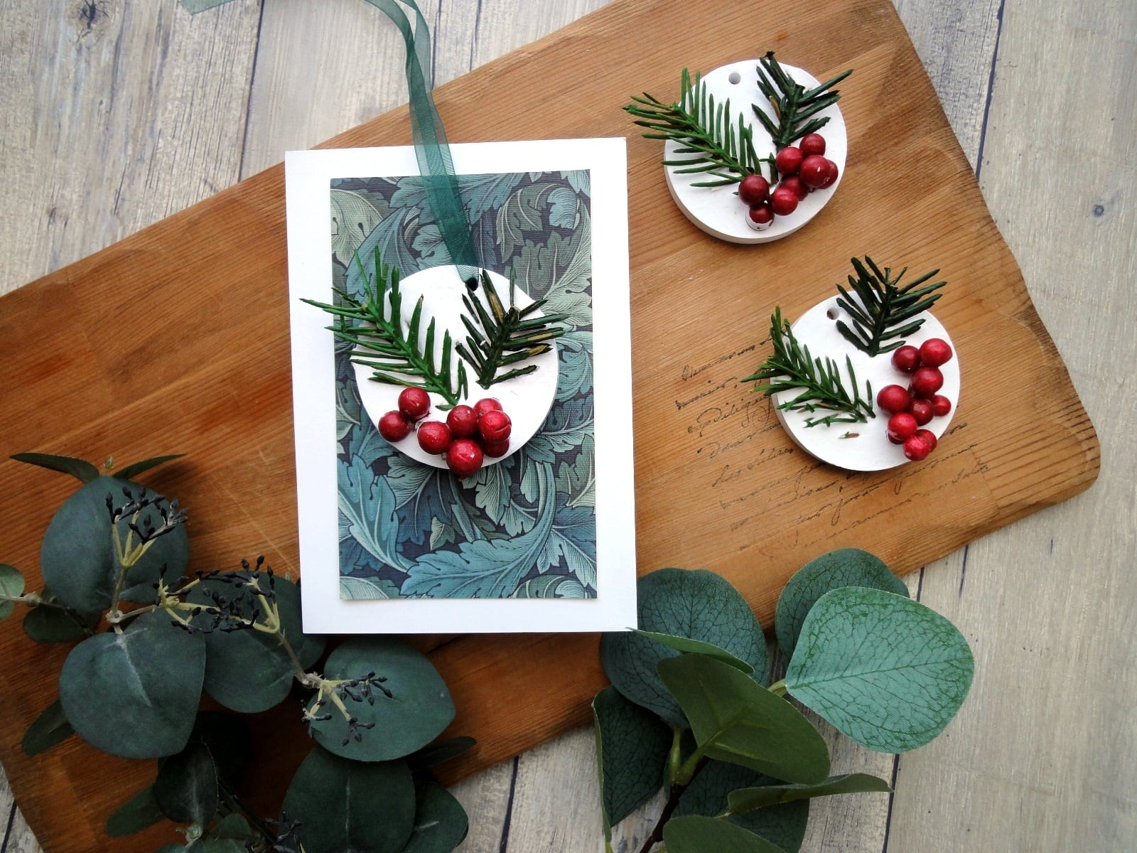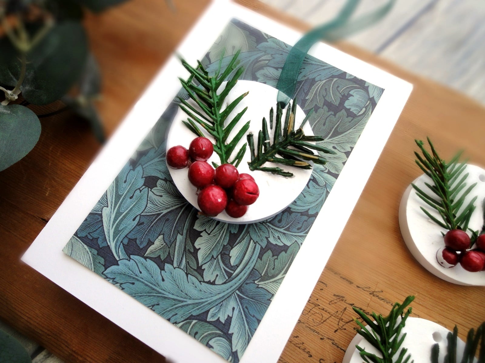 Xmasらしい、赤い木の実ともみの木の枝の組合せ。