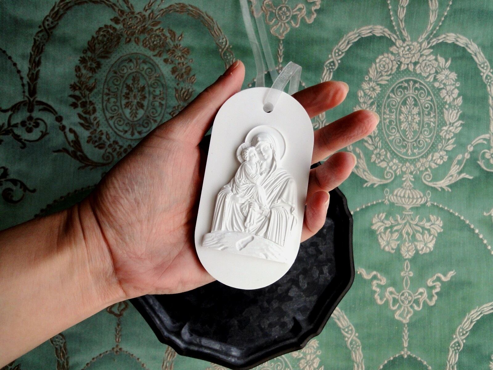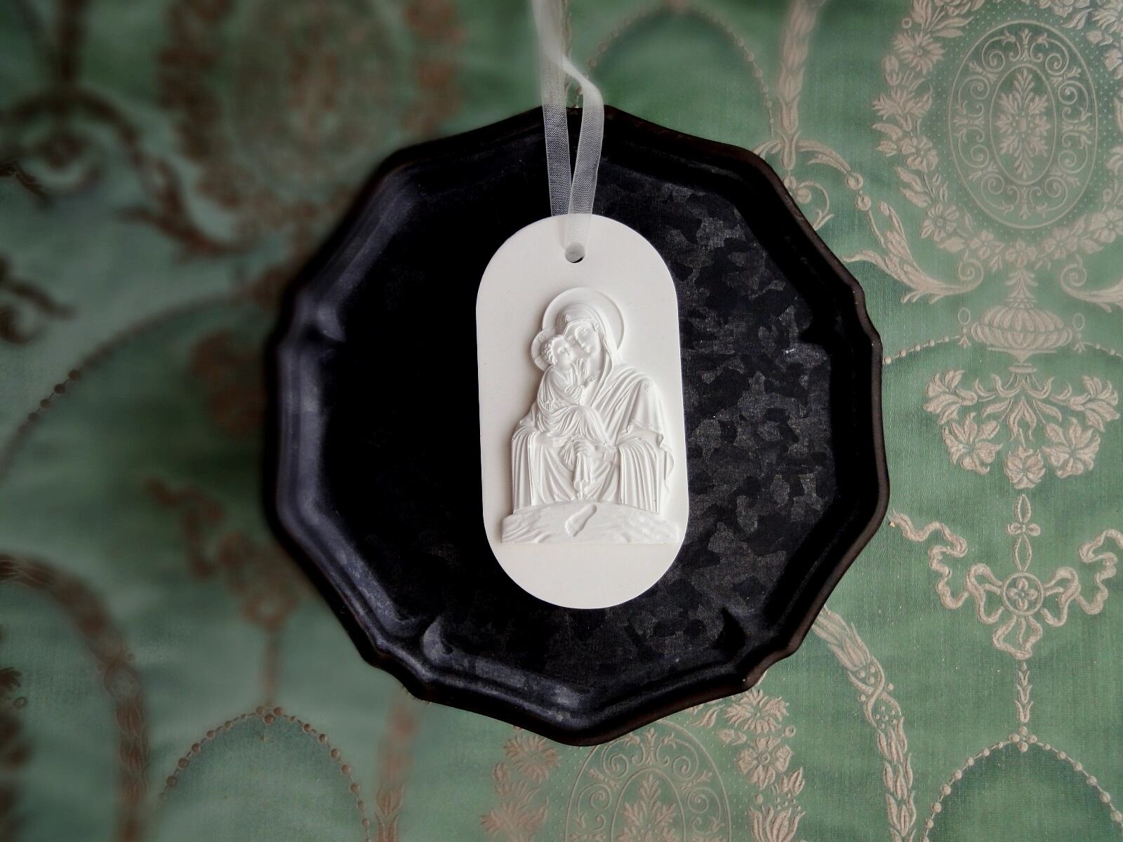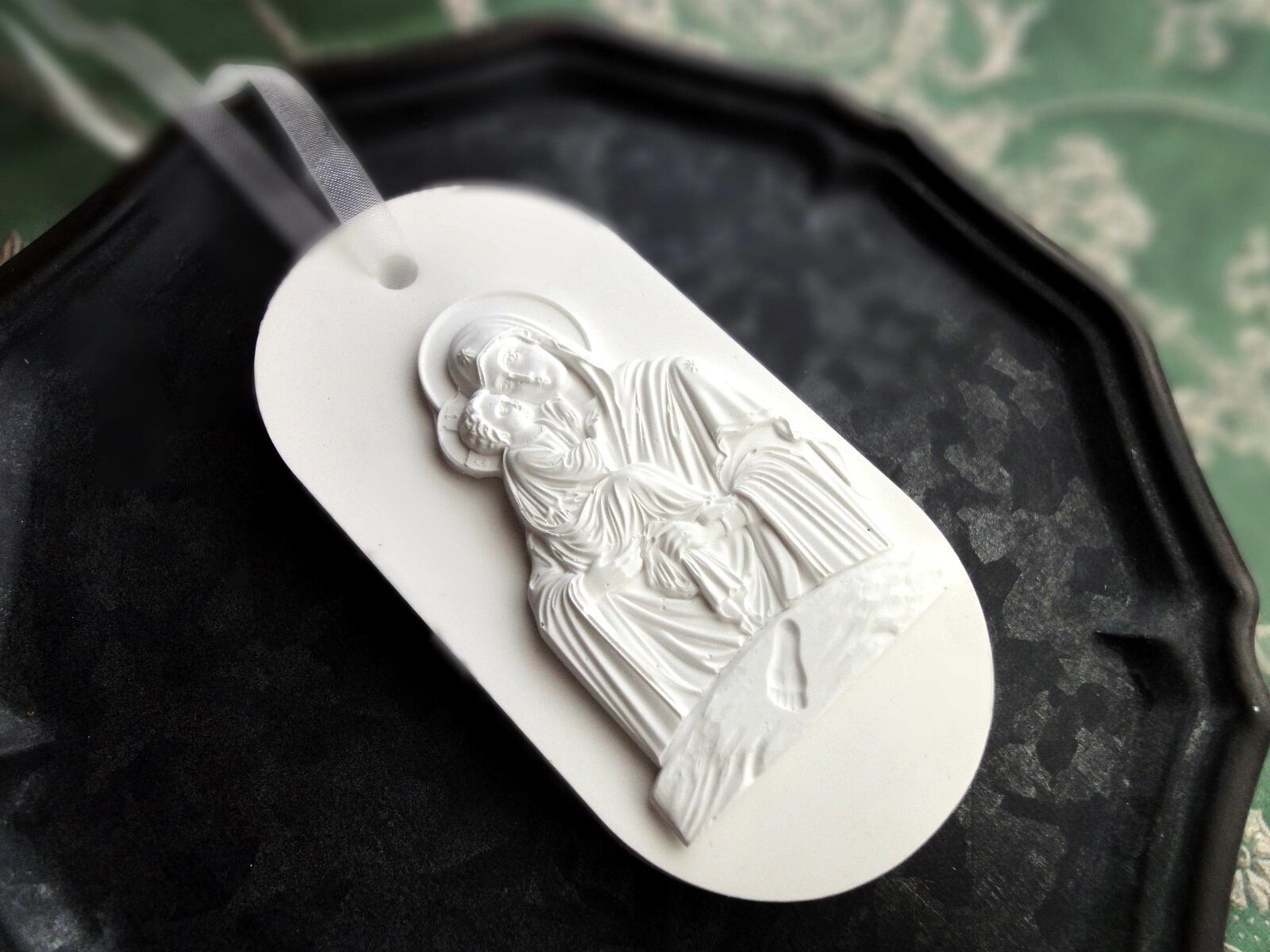 聖母に抱かれる赤子の、細やかなレリーフをアロマストーン製のオーナメントに仕上げました。赤ちゃんの足跡もレリーフに刻まれています。新生児の誕生祝い、出産祝いなどにそっと贈る大人のギフトにもぴったりでしょう。
