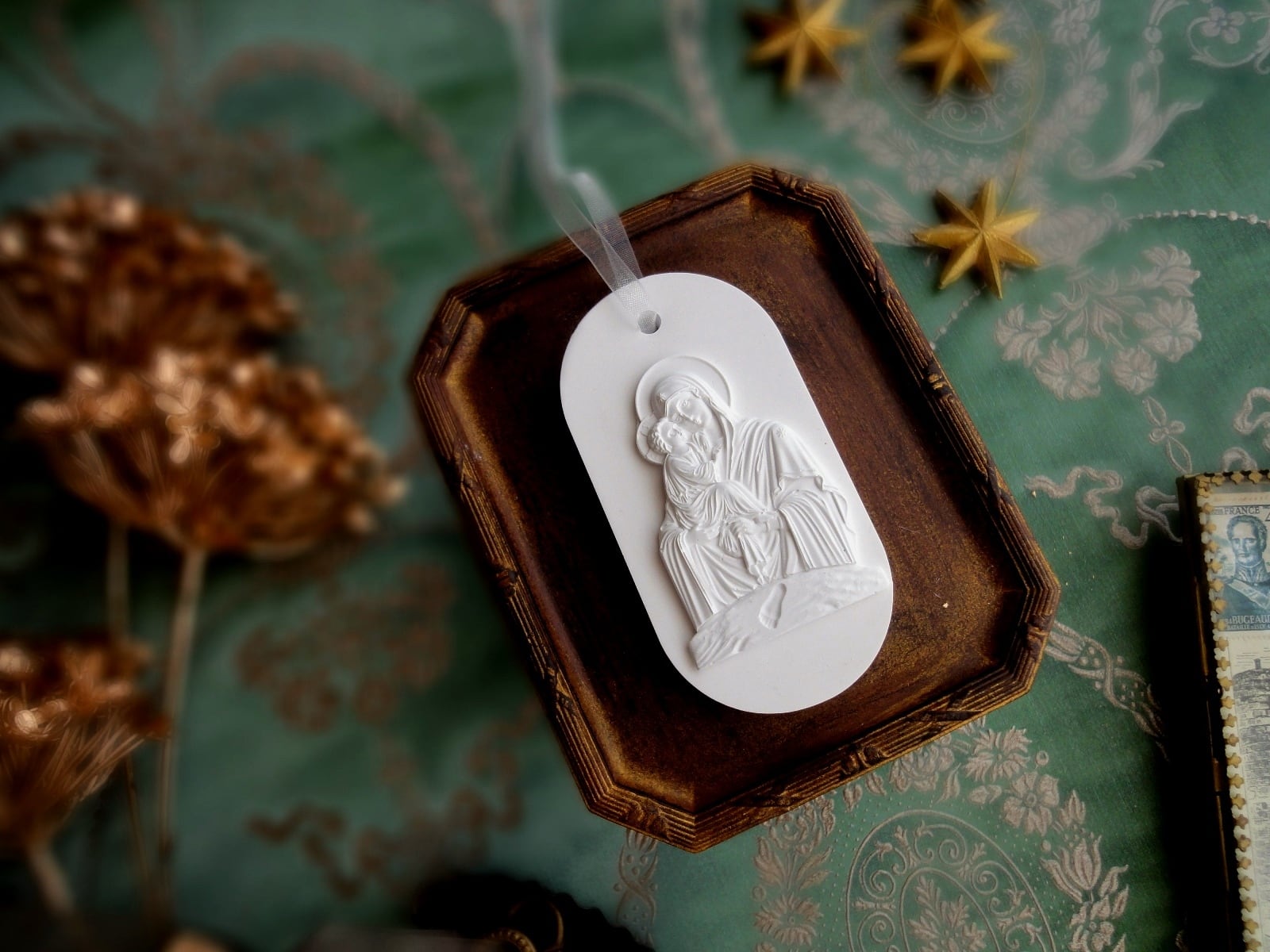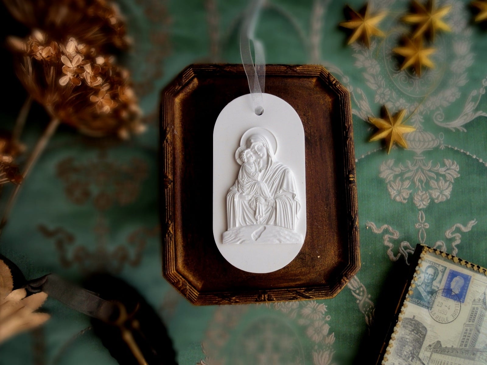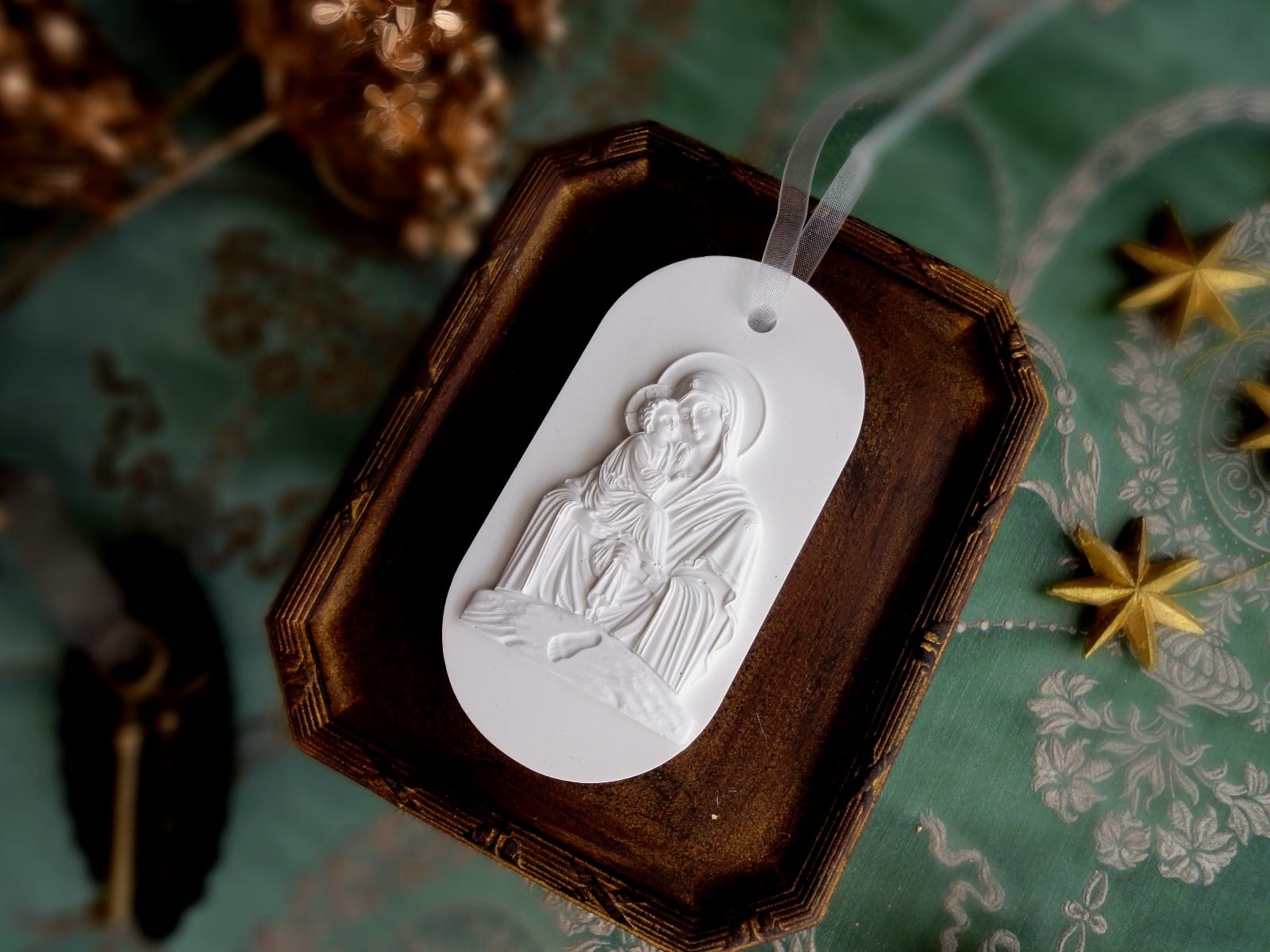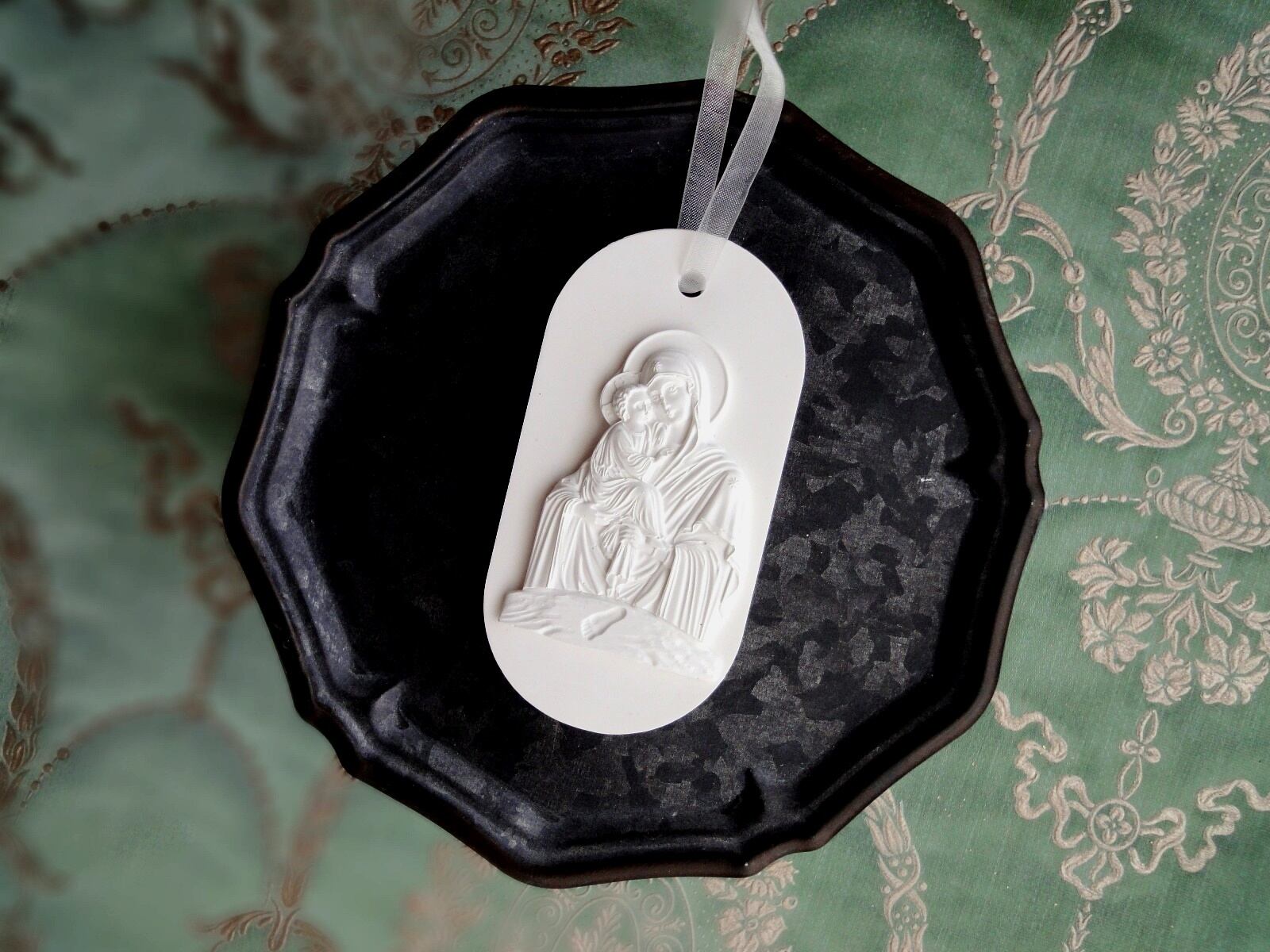 聖母に抱かれる赤子の、細やかなレリーフをアロマストーン製のオーナメントに仕上げました。赤ちゃんの足跡もレリーフに刻まれています。新生児の誕生祝い、出産祝いなどにそっと贈る大人のギフトにもぴったりでしょう。