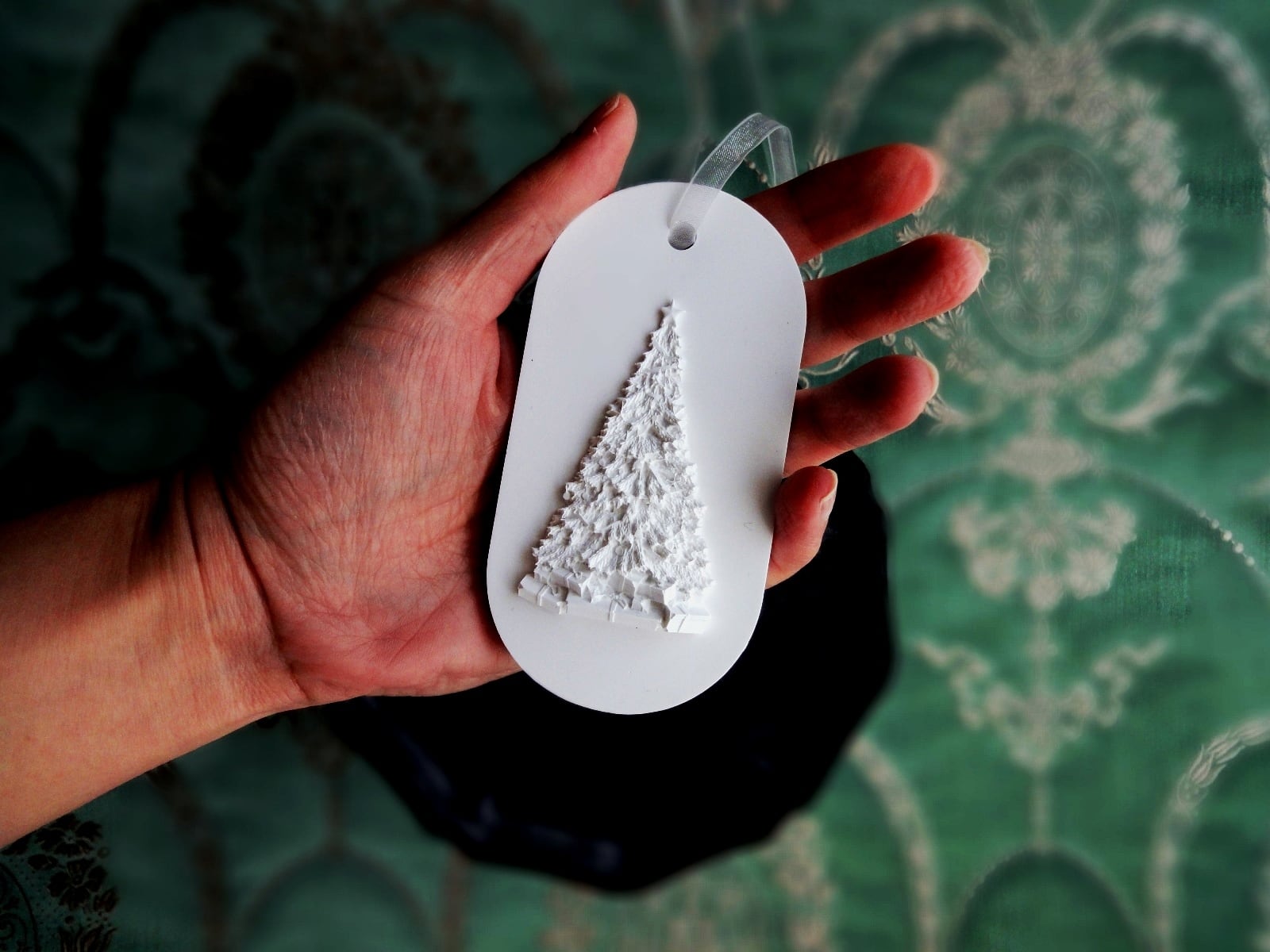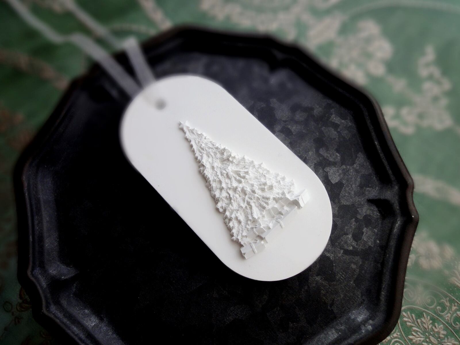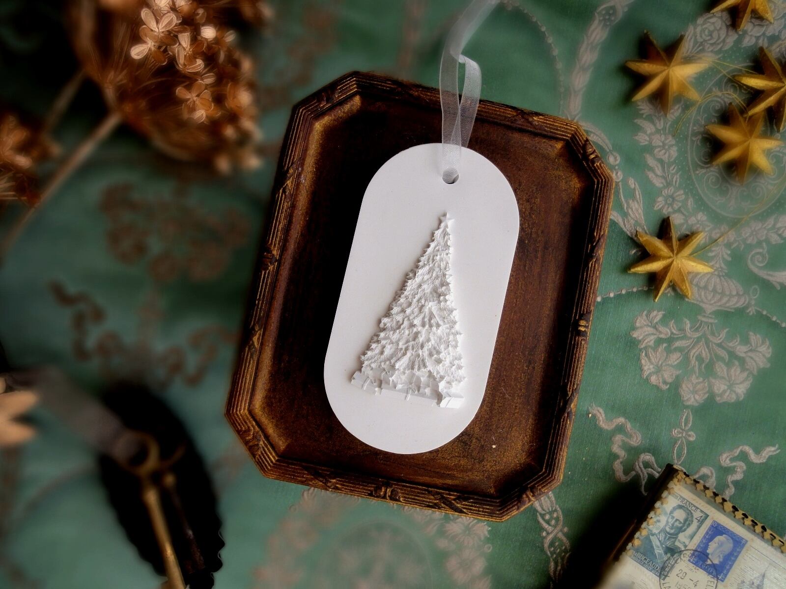 オーナメントは土台の色をホワイト、ブルーグレー色、どちらかを選べます。無垢な真っ白いオーナメントで神聖な世界観の演出に活用ください。また、落ち着きのあるブルーグレー色の背景に真っ白いモチーフを合わせると、洋食器にみかけるカメオ調のデザインになり、より格式高い仕上がりとなります。
