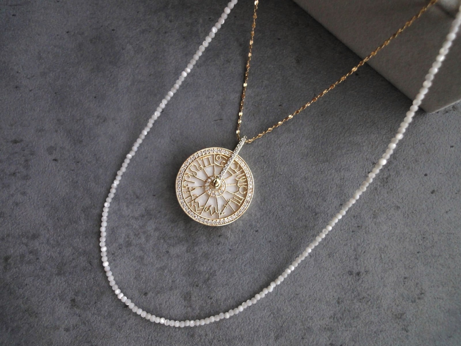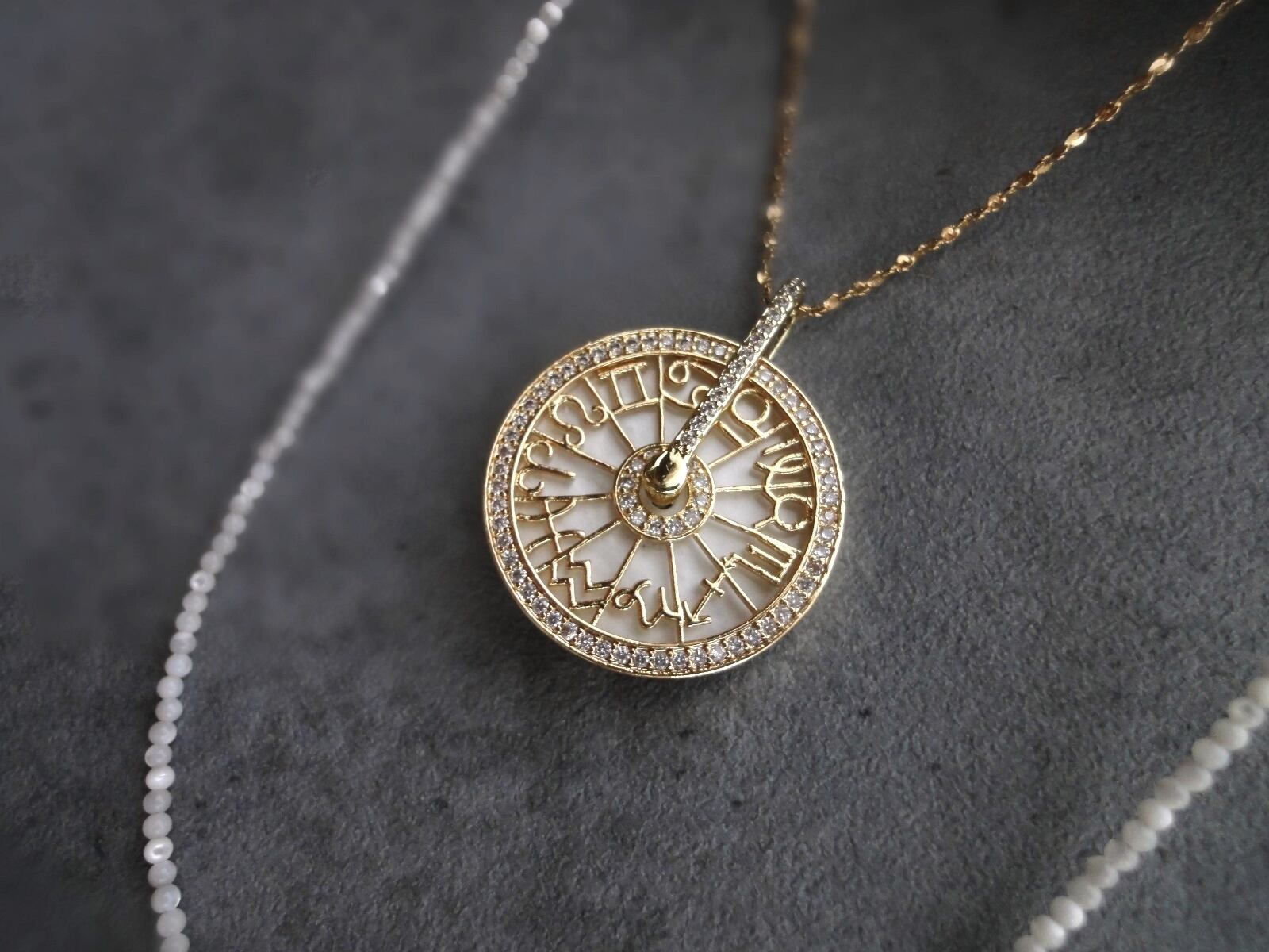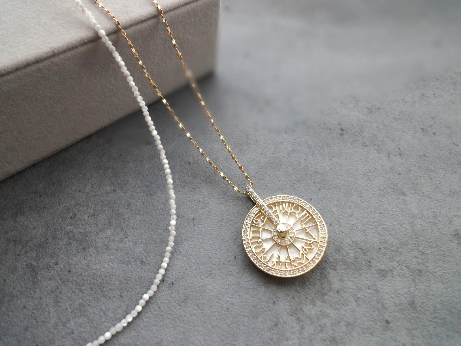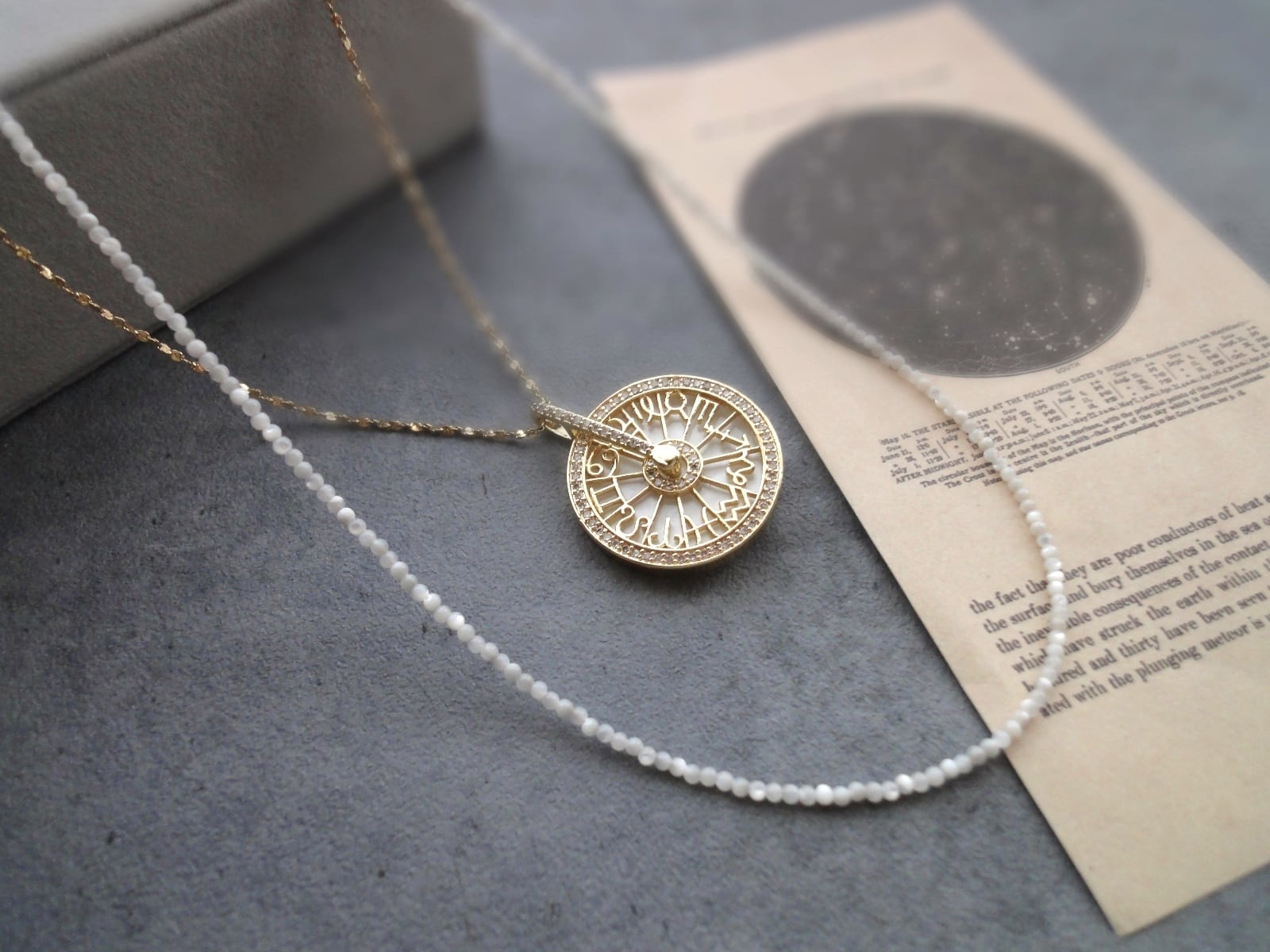 コフレセットの中心となるアイテムは、マザーオブパールを思わせる白を背景に入れた、星座盤のペンダントトップ。お好きなネックレスにペンダントトップを入れ替えて楽しめ、さらには重ね付けもできます。ペンダントトップはとても軽く、キュービックジルコニアの輝きが眩しいです。