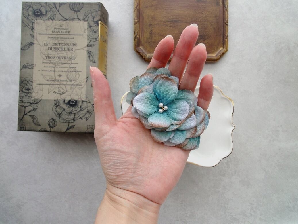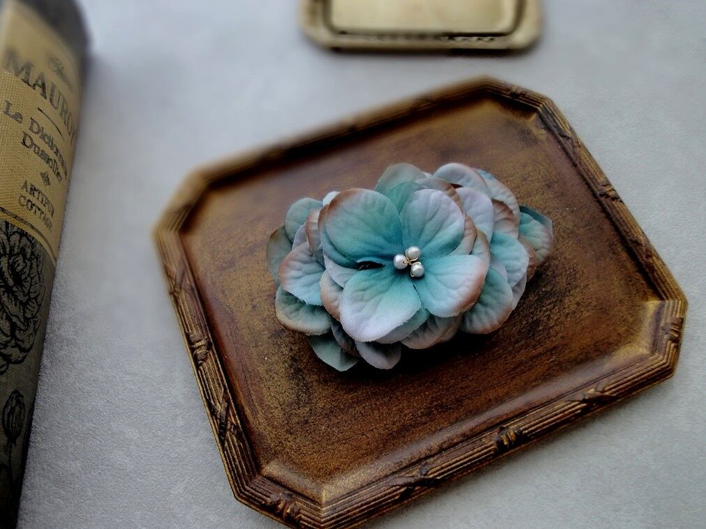 大きく開いた花びらの紫陽花は、ぱっと明るく周りを照らしてくれるような太陽のような印象もあるバレッタ。