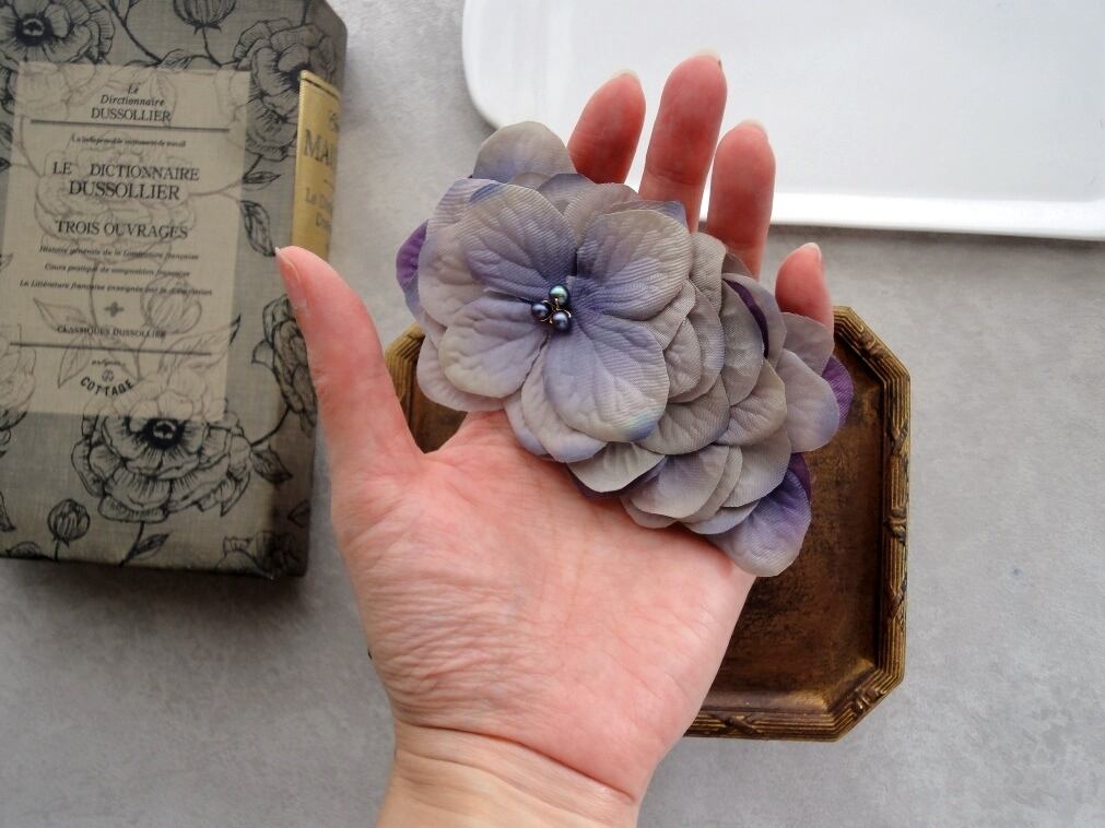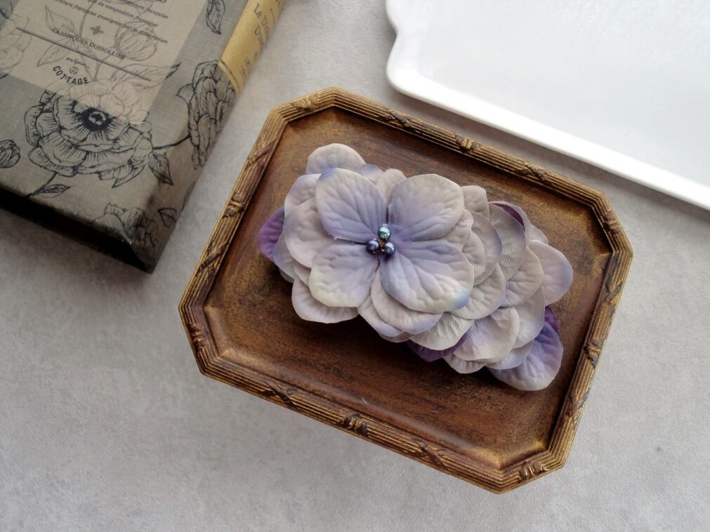大きく開いた花びらの紫陽花は、ぱっと明るく周りを照らしてくれるような太陽のような印象もあるバレッタ。