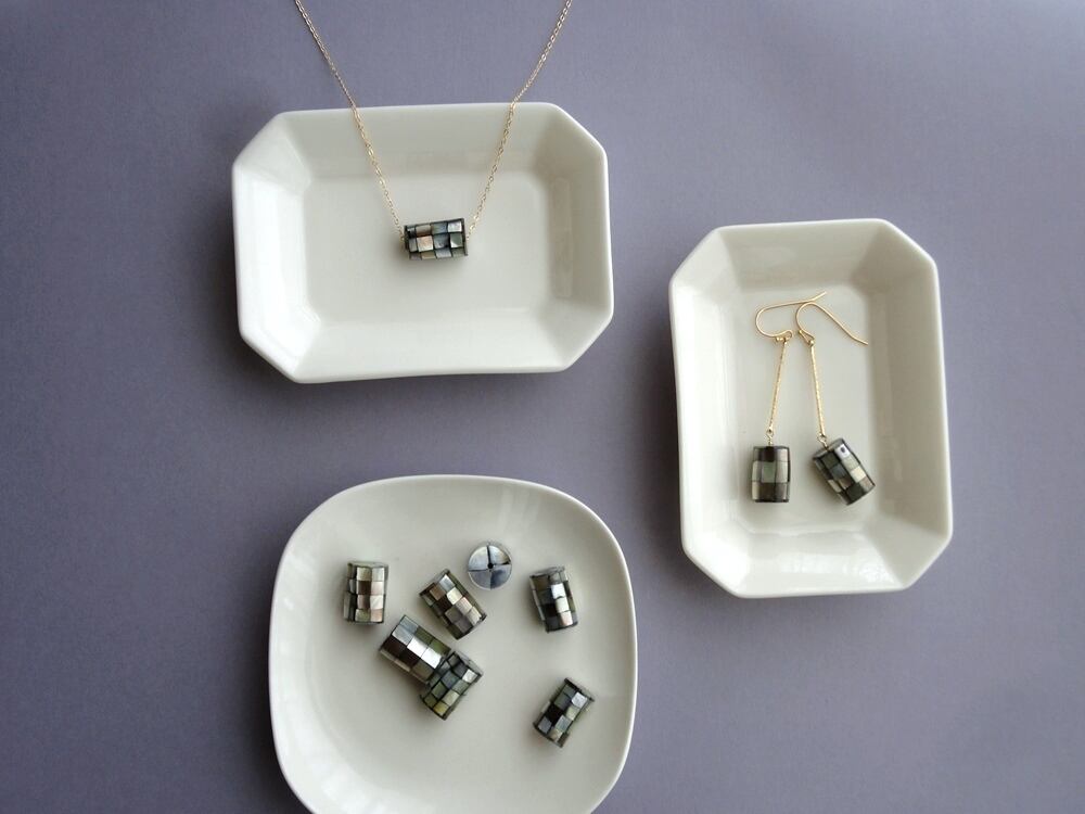 その螺鈿のコイン型や円柱型のパーツに直接チェーンを通して、シンプルなネックレスに仕上げました。