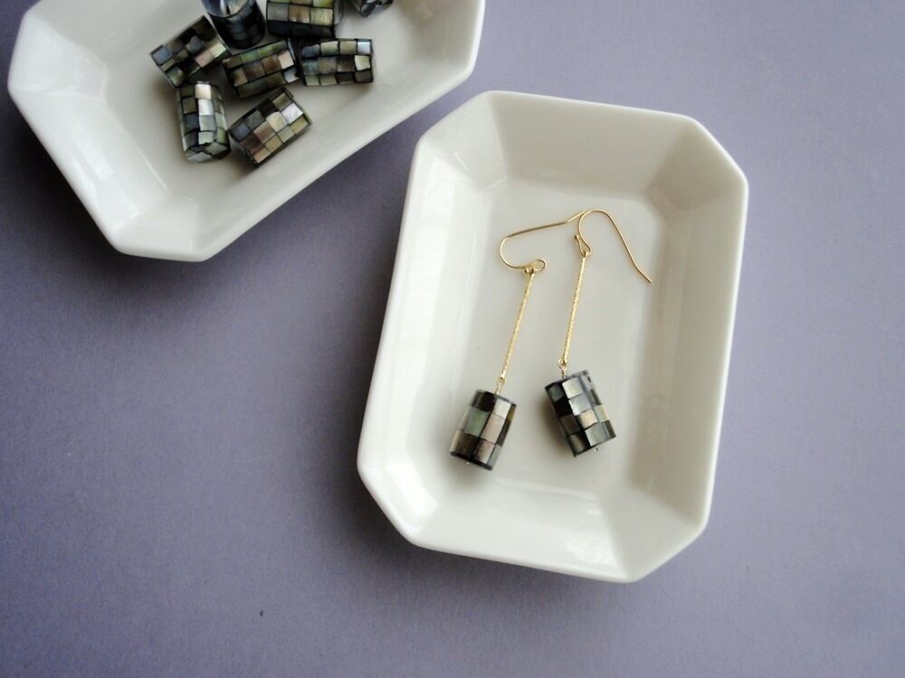 今回は黒く美しい黒蝶貝の円柱状の螺鈿パーツを使い、シックで都会的なピアス・イヤリングに仕上げました。