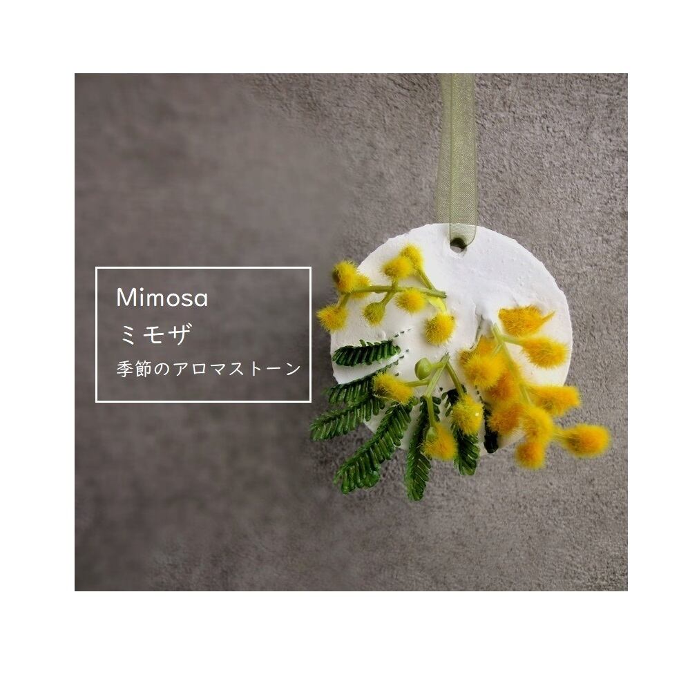 白い円形のアロマストーンの上に季節の花々や植物などを乗せたデザイン。