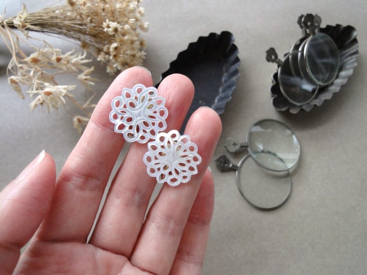 愛らしい透かし彫りを施した貝殻素材の耳飾り。