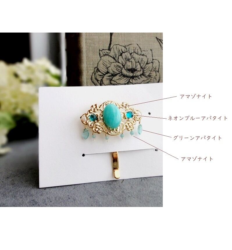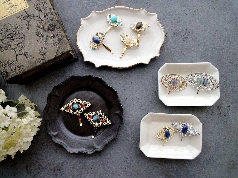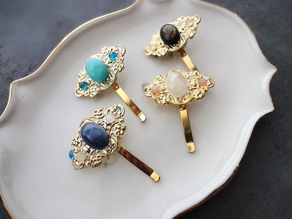 金属の透かし模様に天然石の美しさを組み合わせた、贅沢で輝きの溢れるポニーフック。