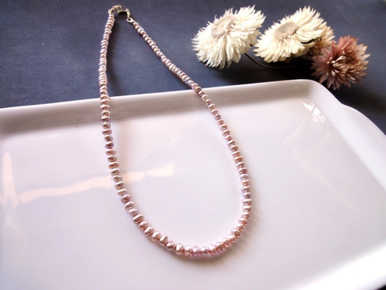 ややグレーがかった、クールな雰囲気のピンク色。グレー系のスーツやニットと色の相性がいい色あいの淡水パールのネックレスです。