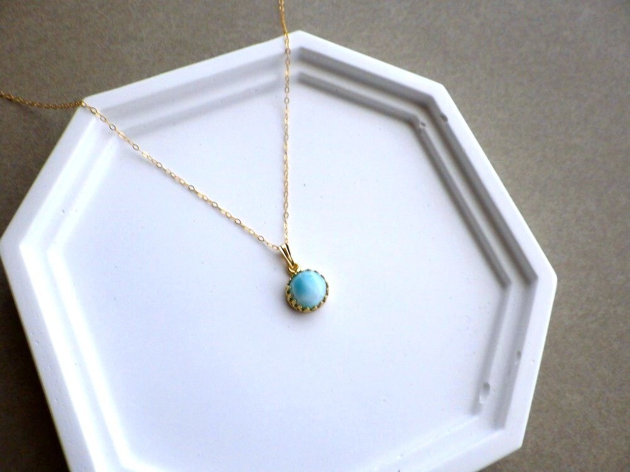 そのラリマーの小さなルースをクラシカルな石座に収めて、小さなペンダントネックレスに仕上げました。