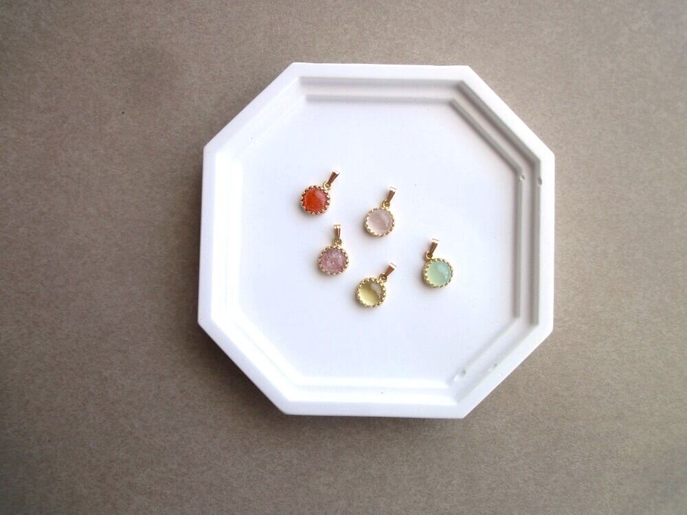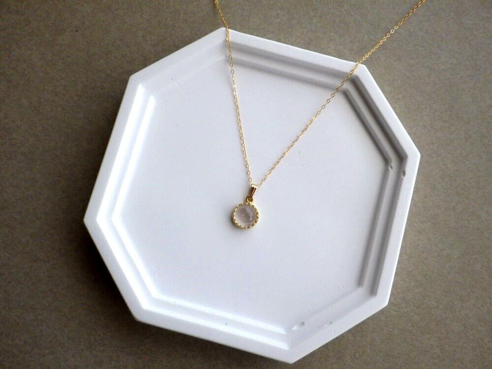 透明感のある淡いピンクの中に、優しく柔らかな光が広がるローズクォーツ。そのローズクォーツで小さなペンダントネックレスをご用意しました。優しい桜色や穏やかな朝焼けを思わせる温かな色合いが特徴です。直径約8mmの天然石のカボションを、繊細な透かし模様の真鍮枠で優しく包み込みました。光の加減で淡くピンク色がさりげなく浮かび上がり、控えめながらも心温まる存在感を放ちます。小さな箱に入れてお届けします。
