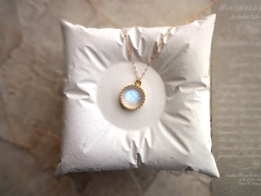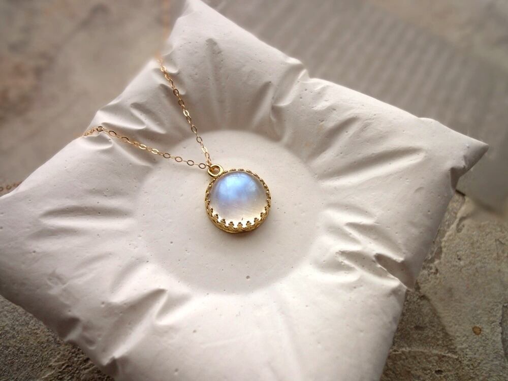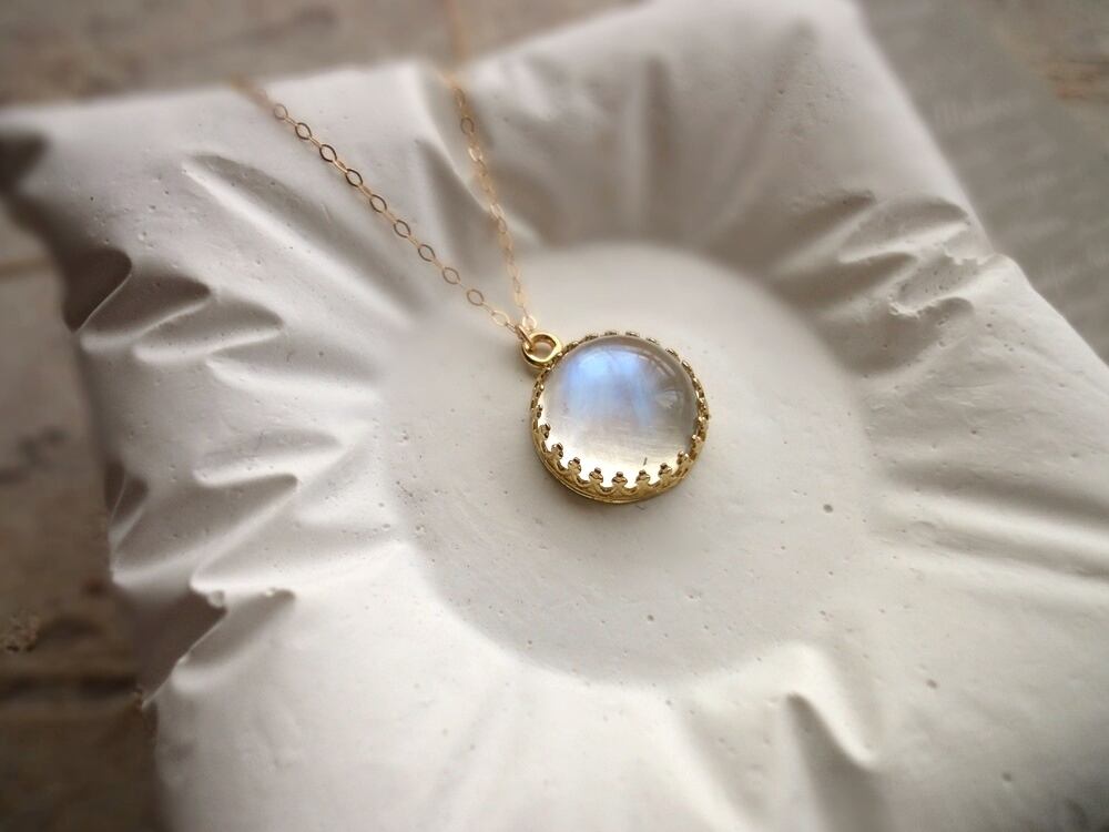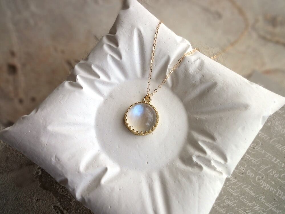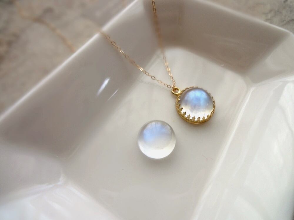 白いほんのりと透明感のある石に、青白い輝きの美しいロイヤルブルームーンストーン。