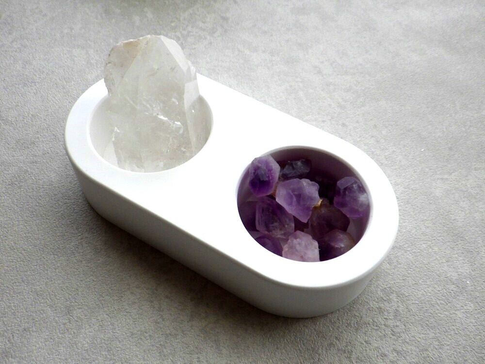 2つの穴が並んだ白いアロマストーンポットに、未研磨の天然石を2種類、組み合わせたアロマディフューザーのセット。香りを楽しむインテリア雑貨です。未研磨の天然石ならではの自然のままの美しさが引き立つ、鉱物がお好きな方に喜んでいただける、香りと天然石の魅力を楽しむセットです。