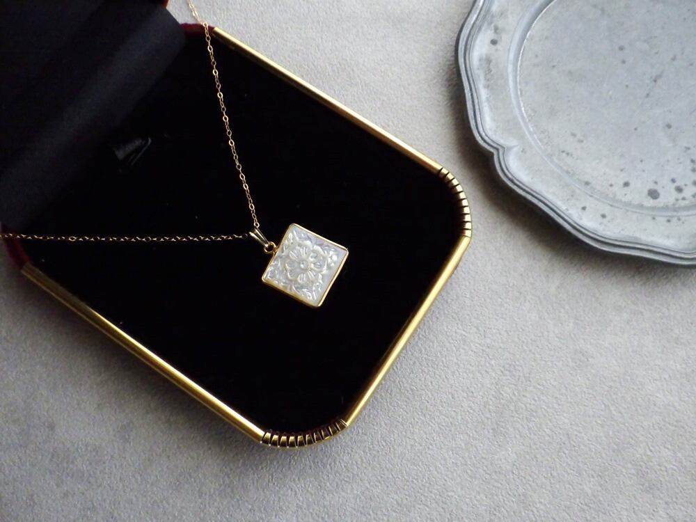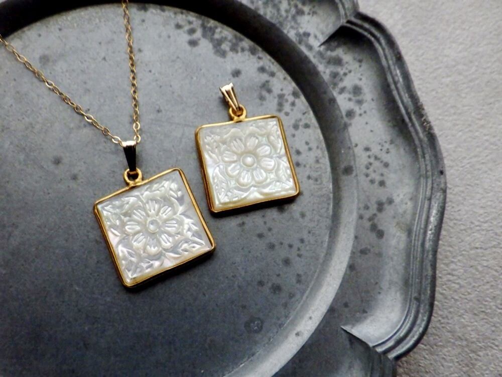 細やかな彫が美しい、花柄のマザーオブパールを18金フレームで加工した、ペンダントネックレス。